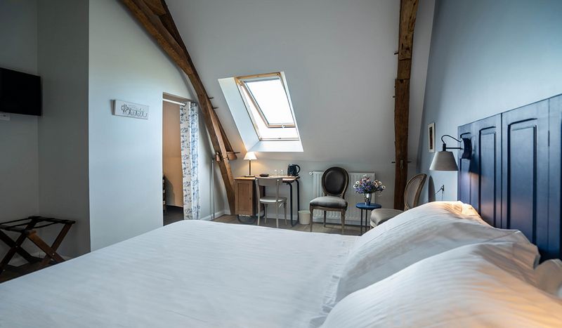Sous les toits au 2ième étage, cette chambre de charme de 24 m2, épurée, est baignée dans le bleu et la lumière tamisée de belles soirées. Vue sur le parc et la campagne orvaltaise !